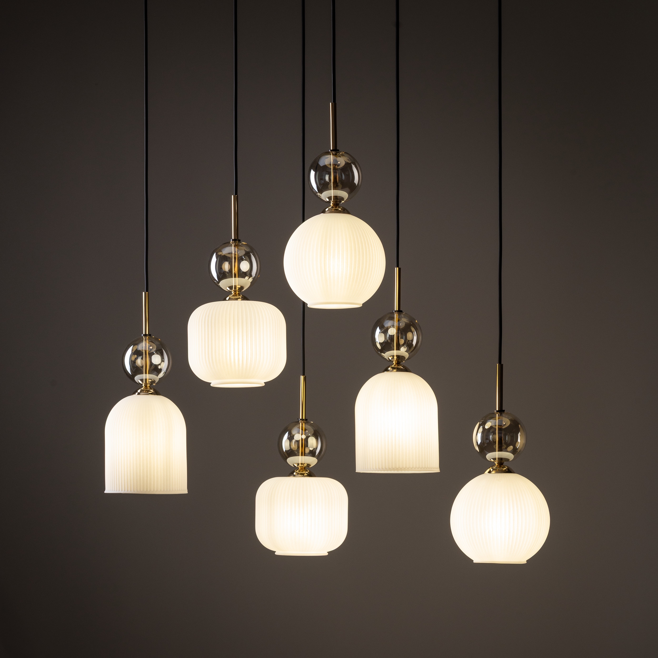 Reprezentativní lustr do interiéru SOPHIA COGNAC WHITE vyniká kombinací bílých rýhovaných skel, černé konstrukce a jemných zlatých detailů. Vytváří příjemné dekorativní osvětlení s rovnoměrným rozptylem světla, ideální do větších prostor jako jsou obývací pokoje nebo jídelny. Výška 1700 mm s možností zkrácení umožňuje přizpůsobení instalace.